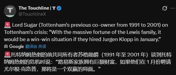 这一低迷表现令弗兰克在热刺的帅位不再稳固。前热刺主席阿兰-苏加公开表达了换帅的想法。这位78岁老人在热刺0-3不敌森林之后大胆提议:热刺应请来利物浦传奇尤尔根·克洛普顶替弗兰克。他在X上写道:“凭借刘易斯家族的巨额财富,如果他们在1月请来尤尔根·克洛普,将是双赢。资金充裕,主帅伟大。谁同意?”